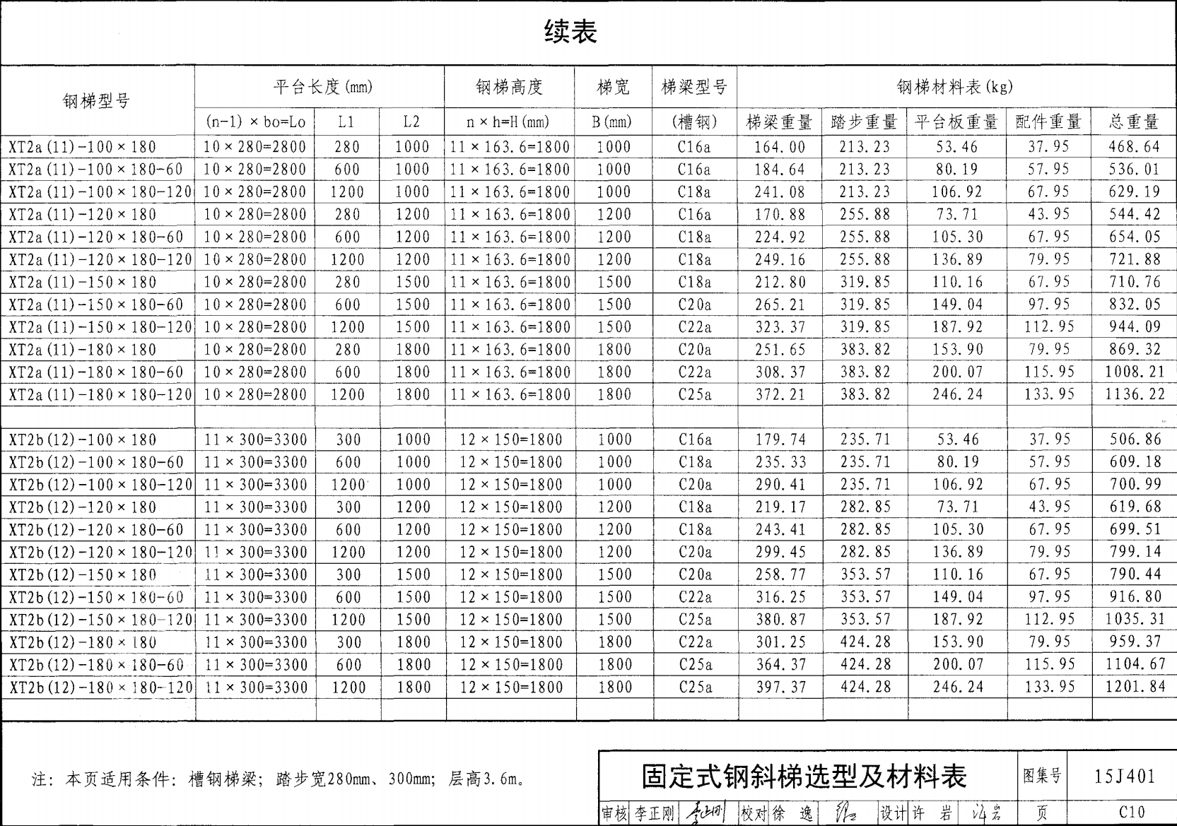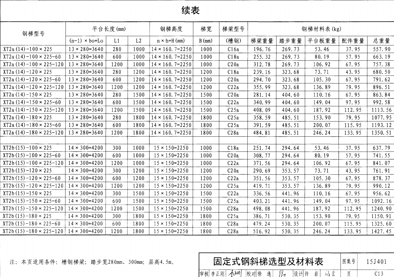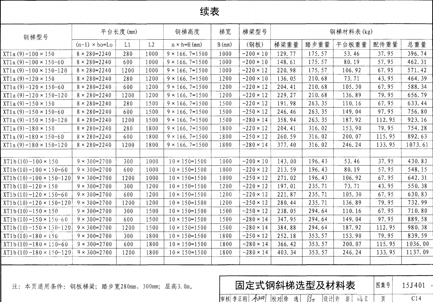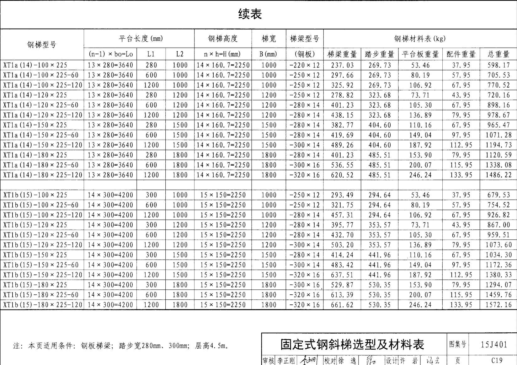 固定式钢斜梯的梯高有 2250mm1500 1650 1800 1950 2100 六种,对应 高,梯宽有3. 3. 3. 3. 4. 2 4. Sm 六种层 1000 1200 1500 1800mm 四种 梯梁分为钢板梯梁和槽钢梯梁两种 固定式钢斜梯踏步宽度有 280 300mm 两种 钢结构图中所注的型钢定位线,除特殊注明外,角钢是 指肢的外边线;槽钢是指腹板外边线本图集中间休息平台均包括在梯段中 楼梯栏杆选用国标图集 15J403-1 《楼梯栏杆栏板(一)》