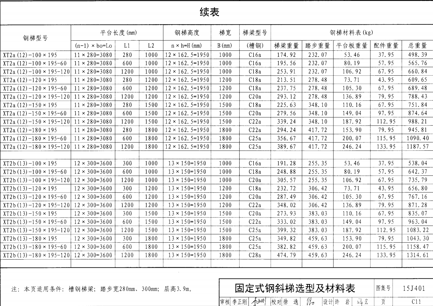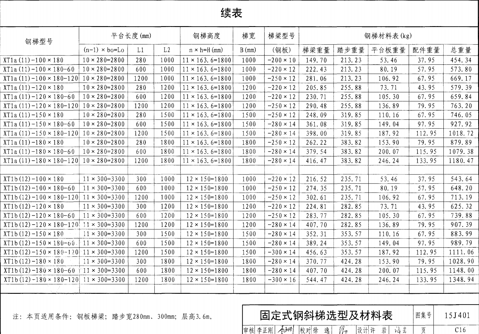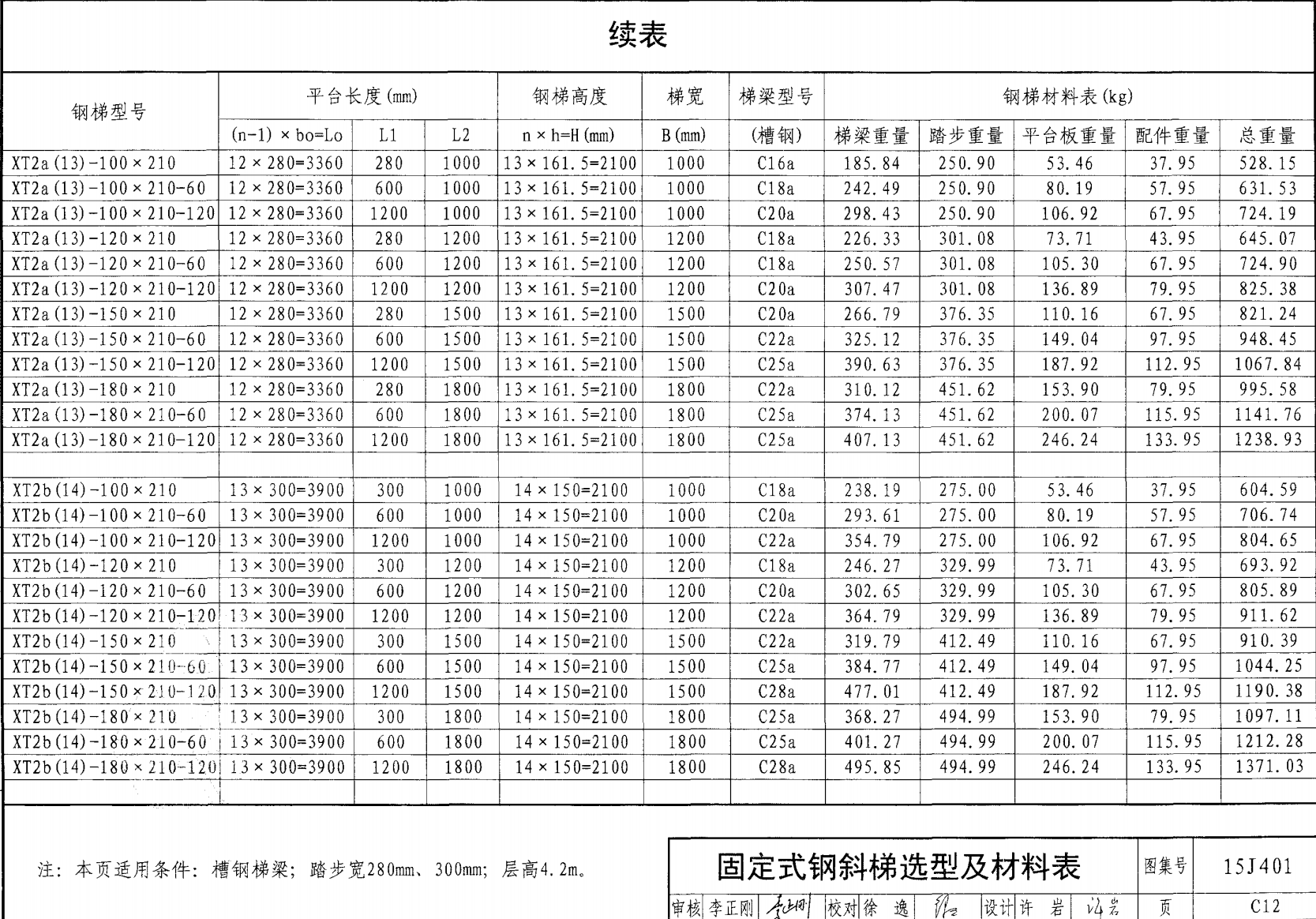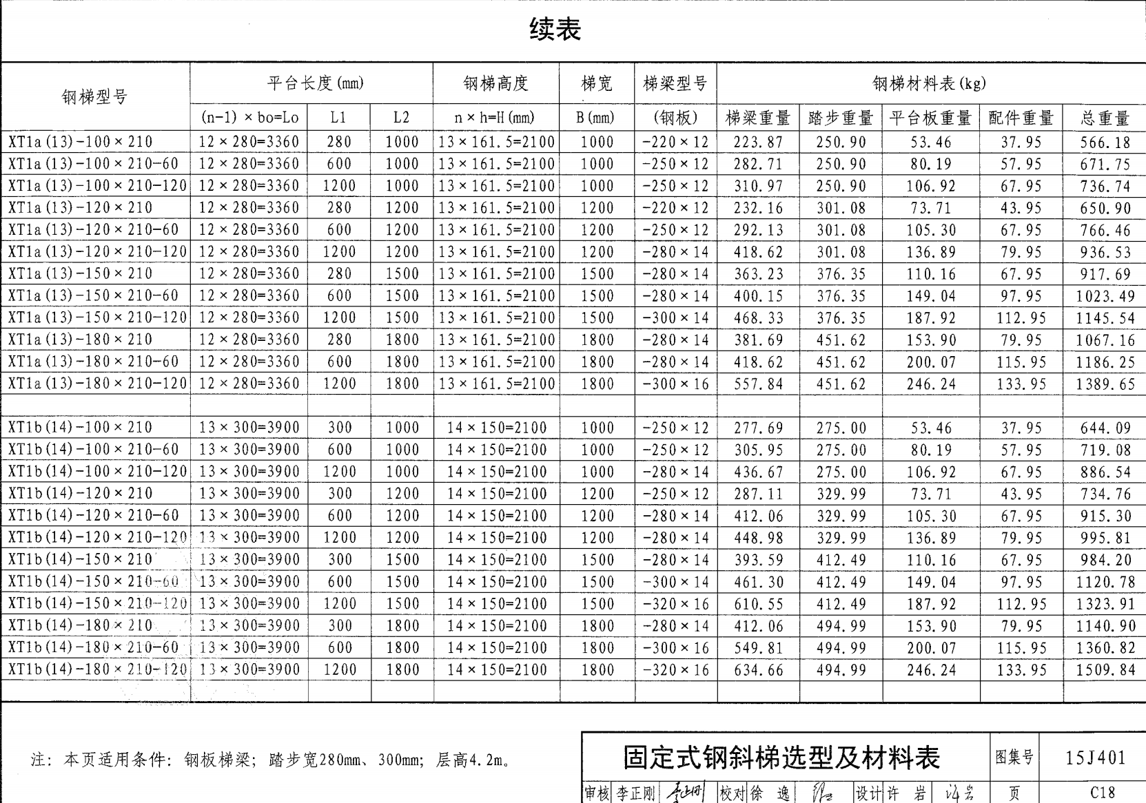 固定式钢斜梯的梯高有 2250mm1500 1650 1800 1950 2100 六种,对应 高,梯宽有3. 3. 3. 3. 4. 2 4. Sm 六种层 1000 1200 1500 1800mm 四种 梯梁分为钢板梯梁和槽钢梯梁两种 固定式钢斜梯踏步宽度有 280 300mm 两种 钢结构图中所注的型钢定位线,除特殊注明外,角钢是 指肢的外边线;槽钢是指腹板外边线本图集中间休息平台均包括在梯段中 楼梯栏杆选用国标图集 15J403-1 《楼梯栏杆栏板(一)》