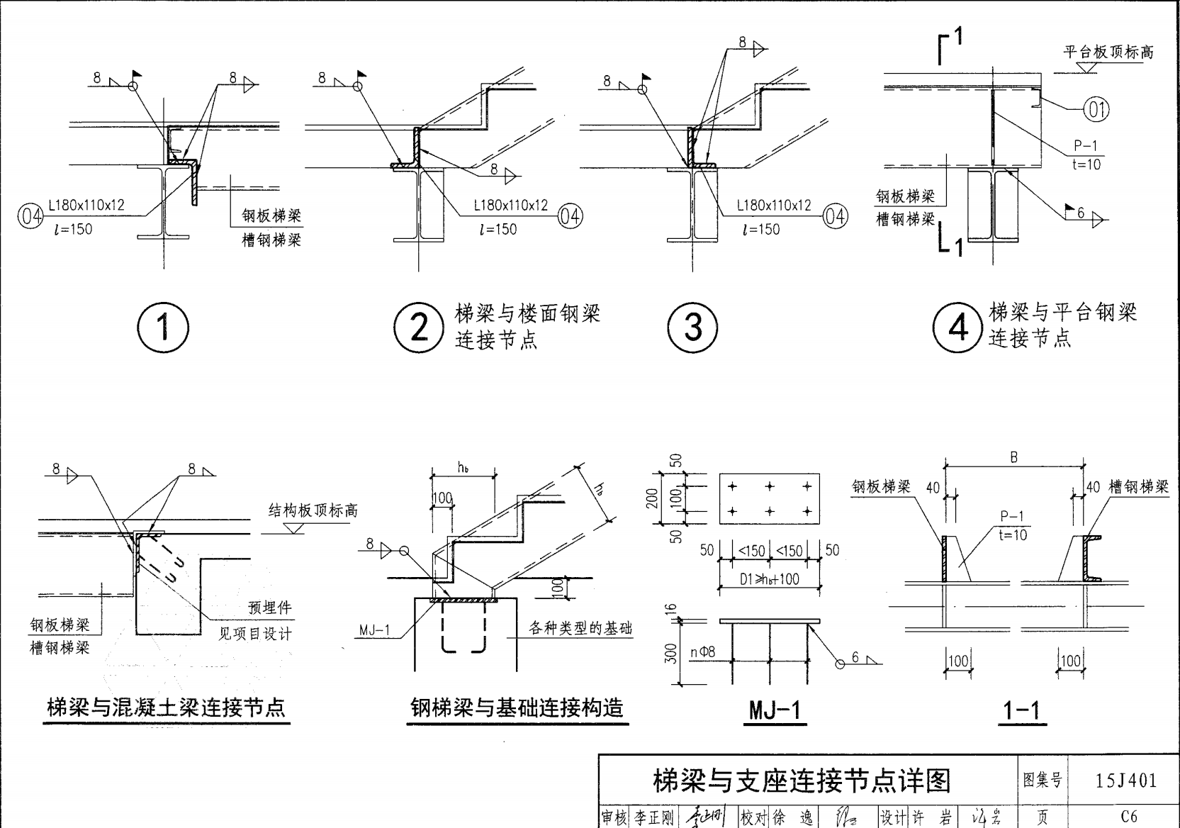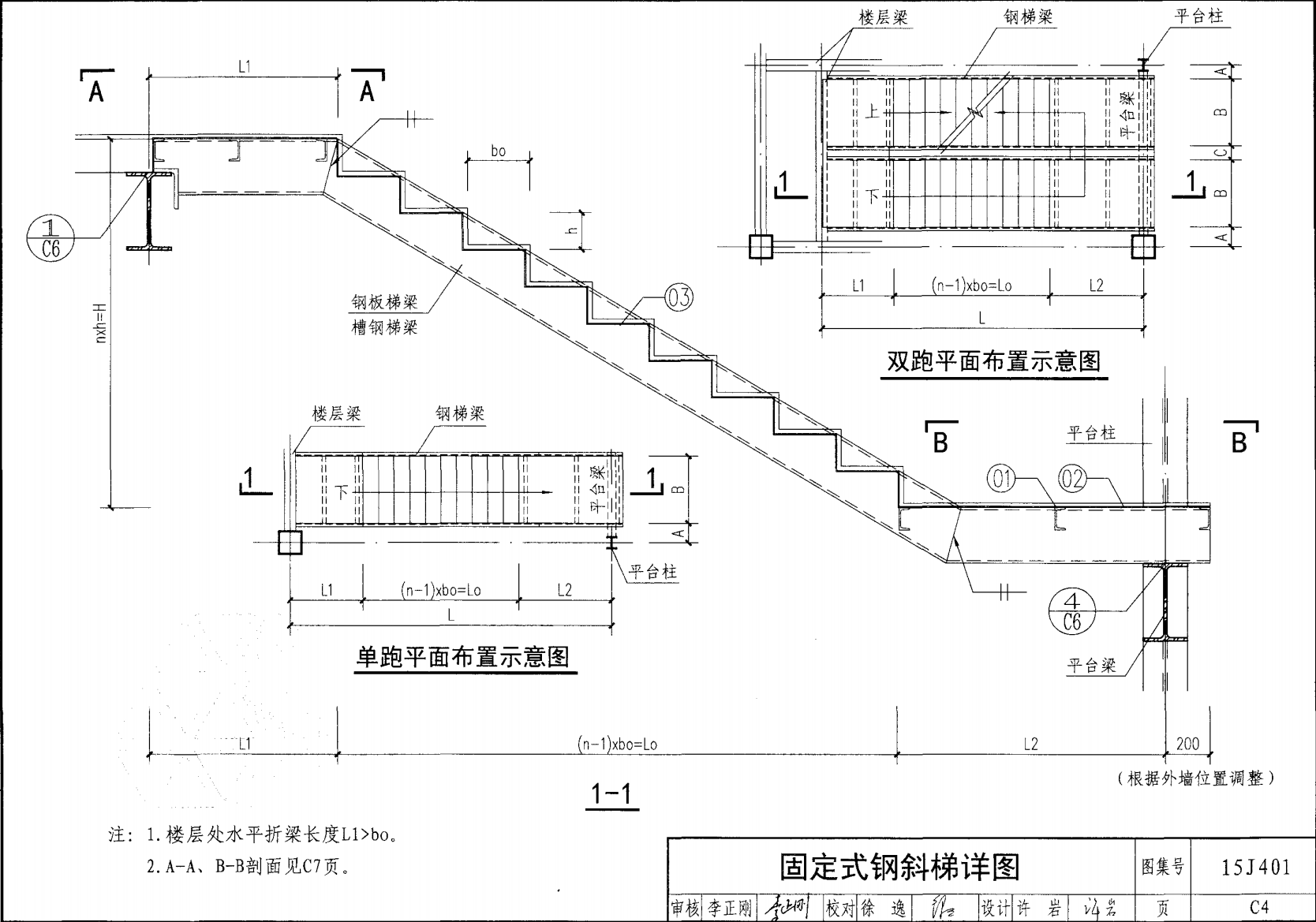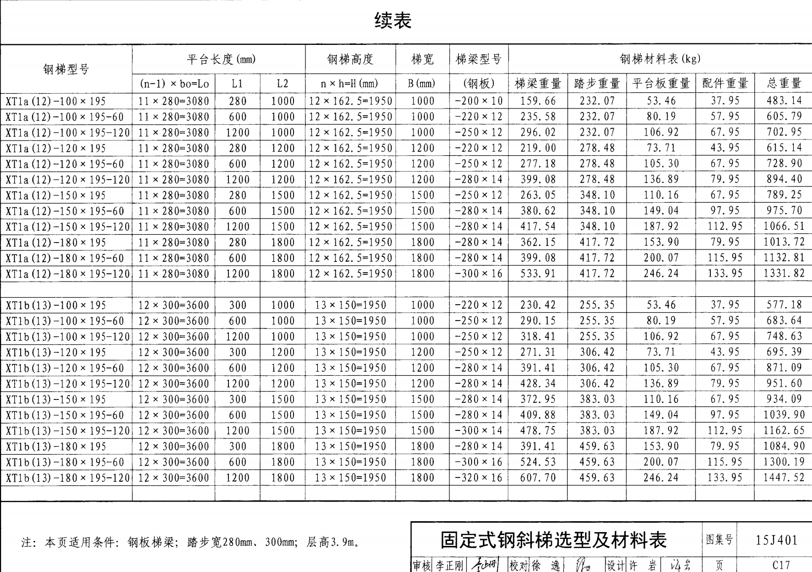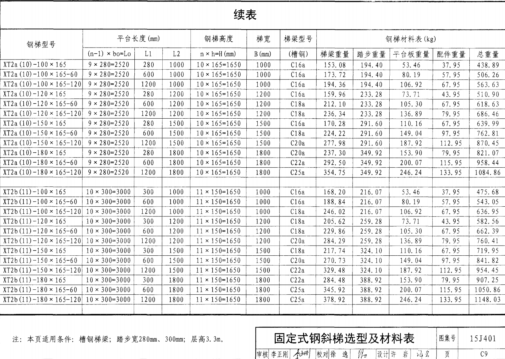 固定式钢斜梯的梯高有 2250mm1500 1650 1800 1950 2100 六种,对应 高,梯宽有3. 3. 3. 3. 4. 2 4. Sm 六种层 1000 1200 1500 1800mm 四种 梯梁分为钢板梯梁和槽钢梯梁两种 固定式钢斜梯踏步宽度有 280 300mm 两种 钢结构图中所注的型钢定位线,除特殊注明外,角钢是 指肢的外边线;槽钢是指腹板外边线本图集中间休息平台均包括在梯段中 楼梯栏杆选用国标图集 15J403-1 《楼梯栏杆栏板(一)》