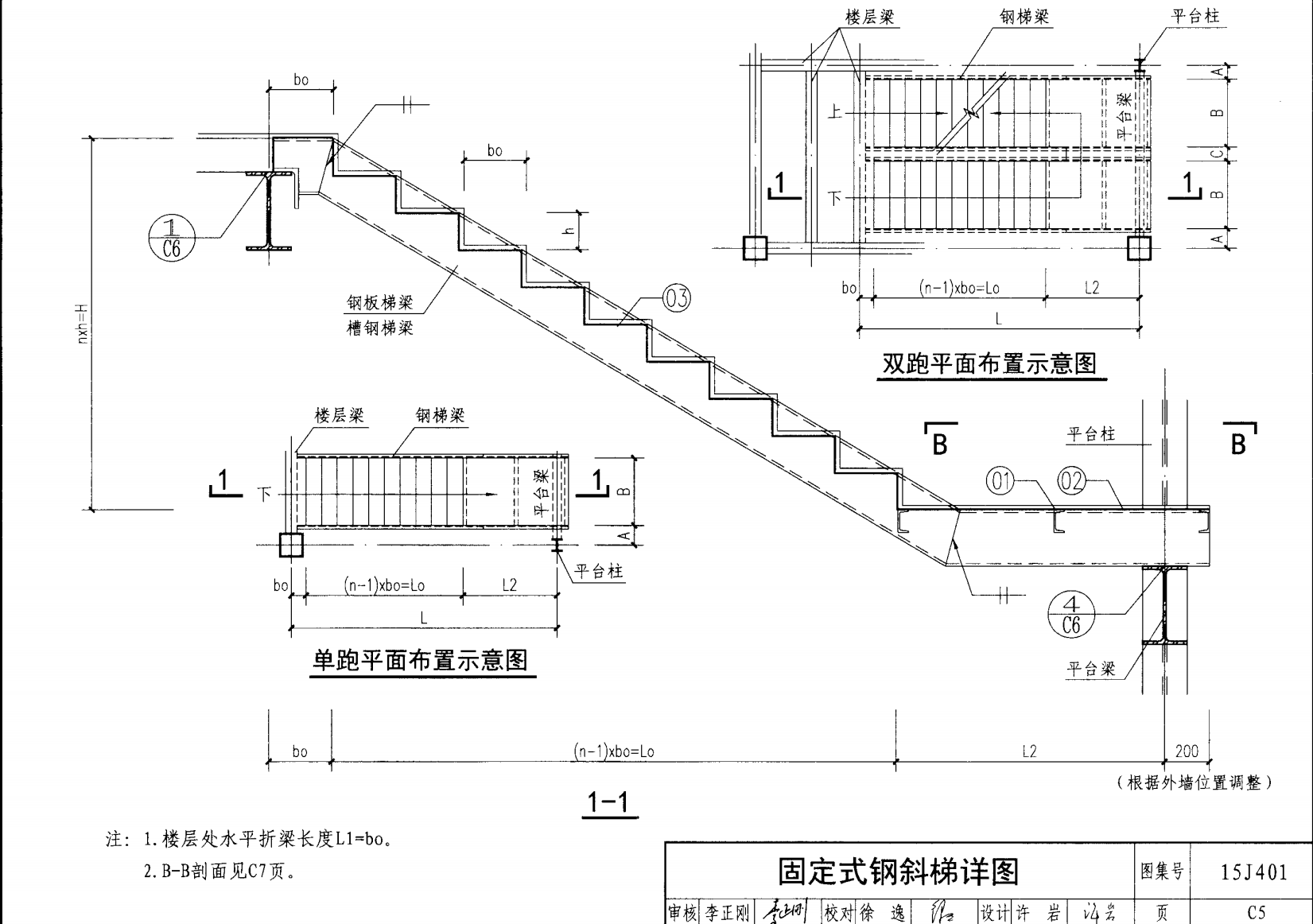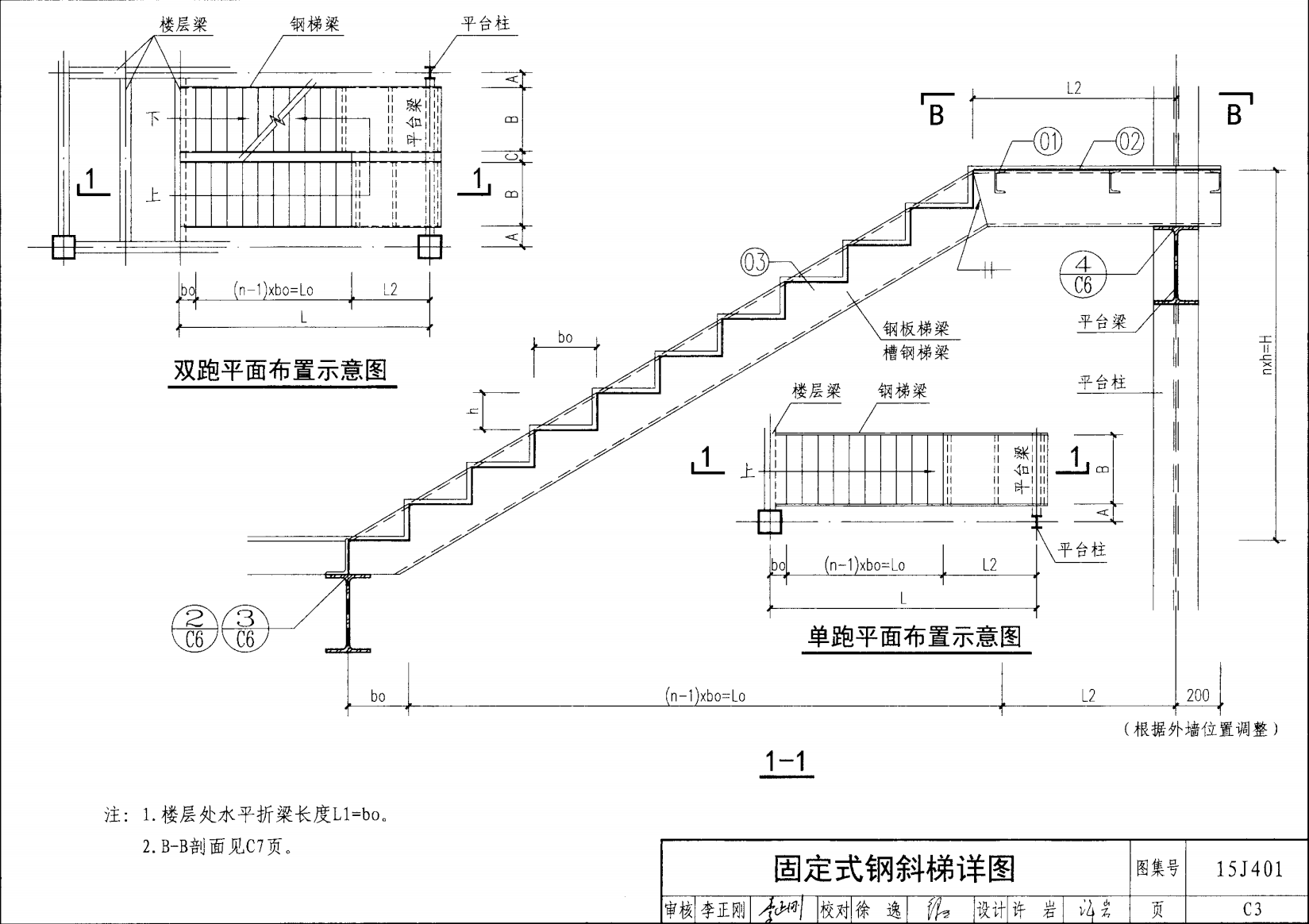 n一一钢斜梯踏步数 bo 一一踏步宽、高 B一一梯段净宽 一一梯高Lo 一一斜梁水平段长度, Lo= (n 1) x bo L1 一一楼层处水平折梁长度( bo 0. 6m 1. 2m 三种) L2 一一中间平台处水平折梁长度,取 L2=Bo